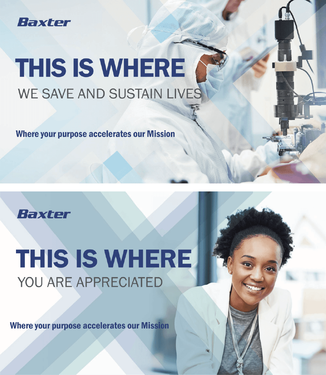 The visual system builds from Baxter’s established brand language, using a dynamic “X” motif in multiple color schemes to represent the intersection of care, innovation, and global collaboration. This motif creates a flexible graphic structure that scales across environmental installations, digital displays, and communication materials while maintaining visual consistency.
