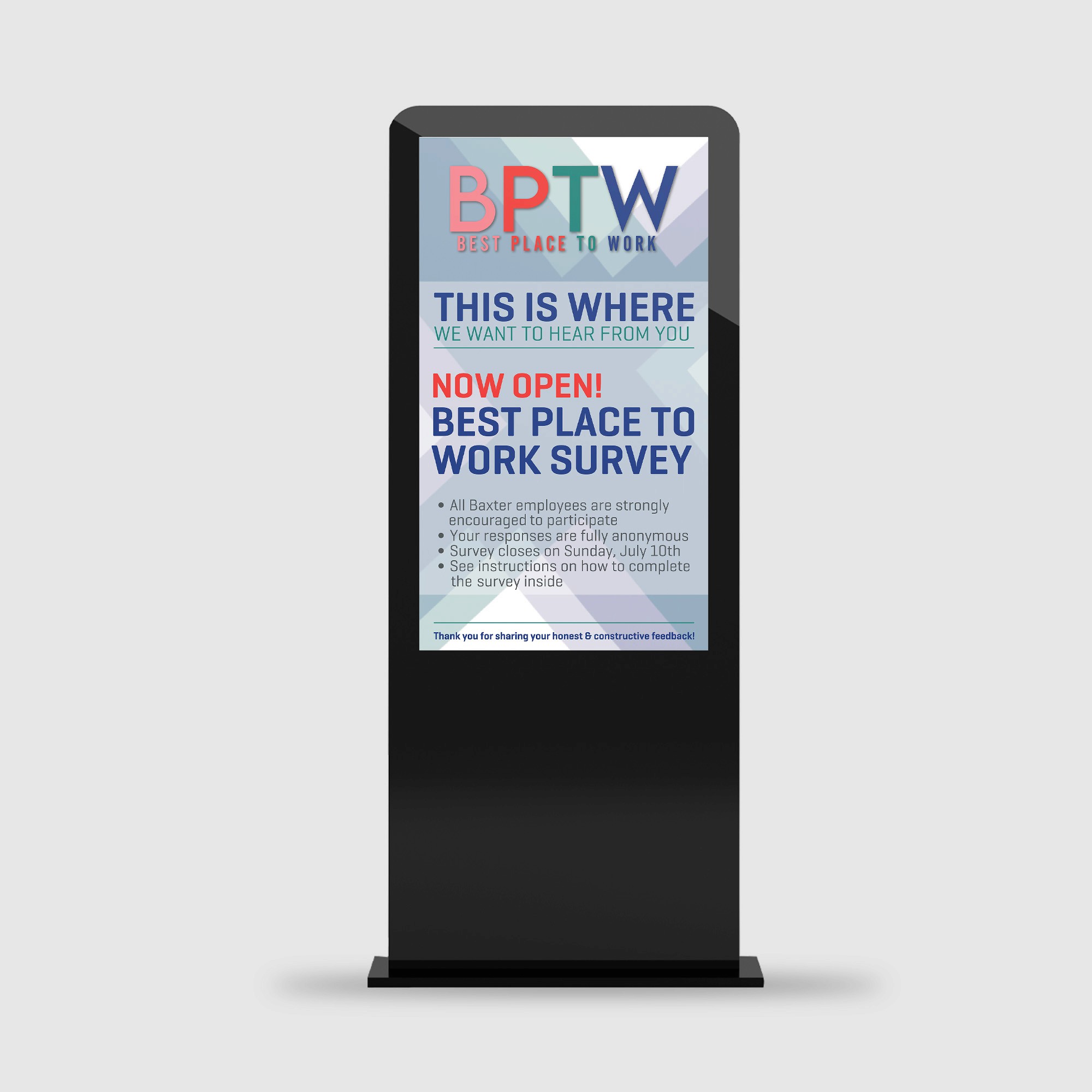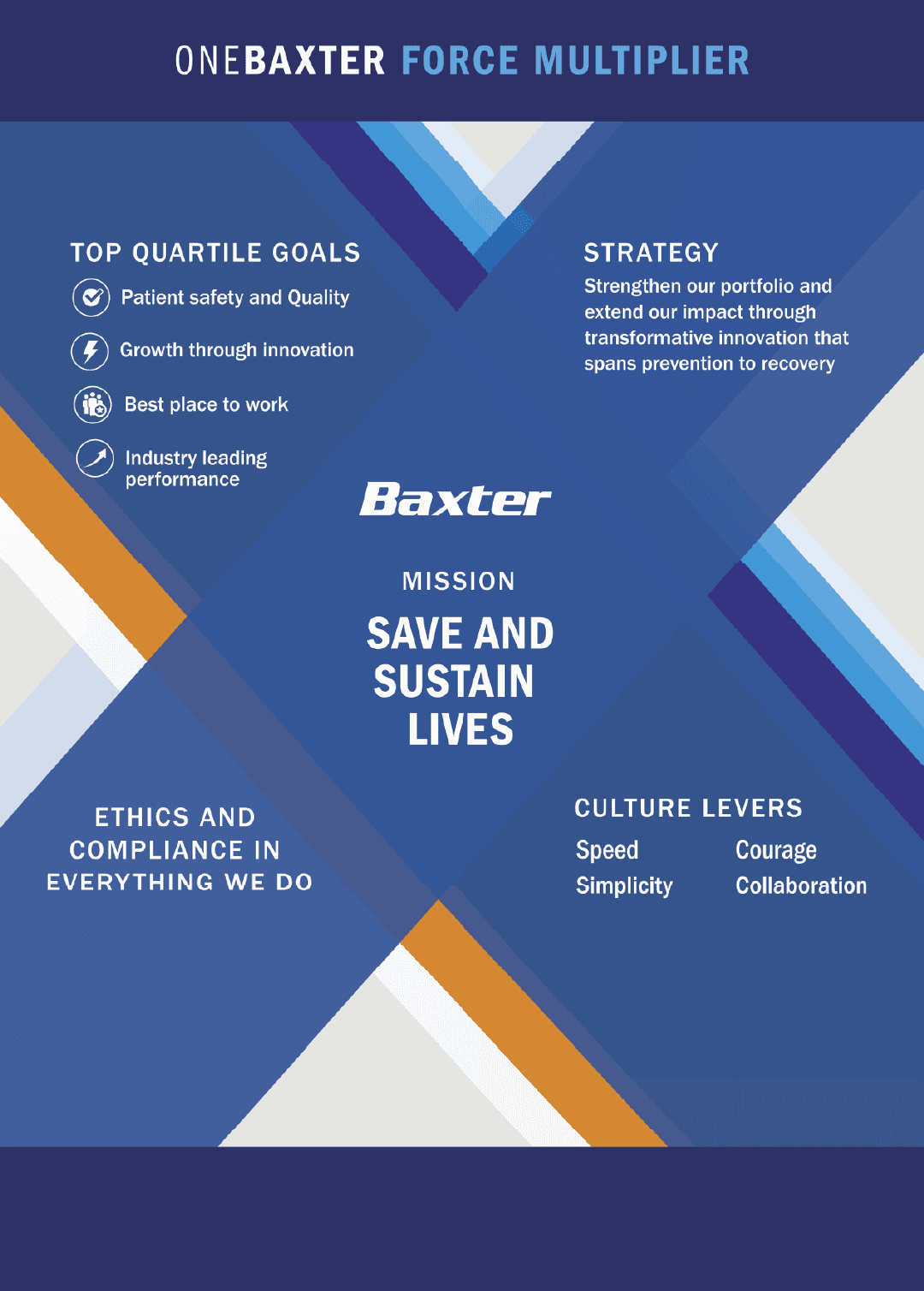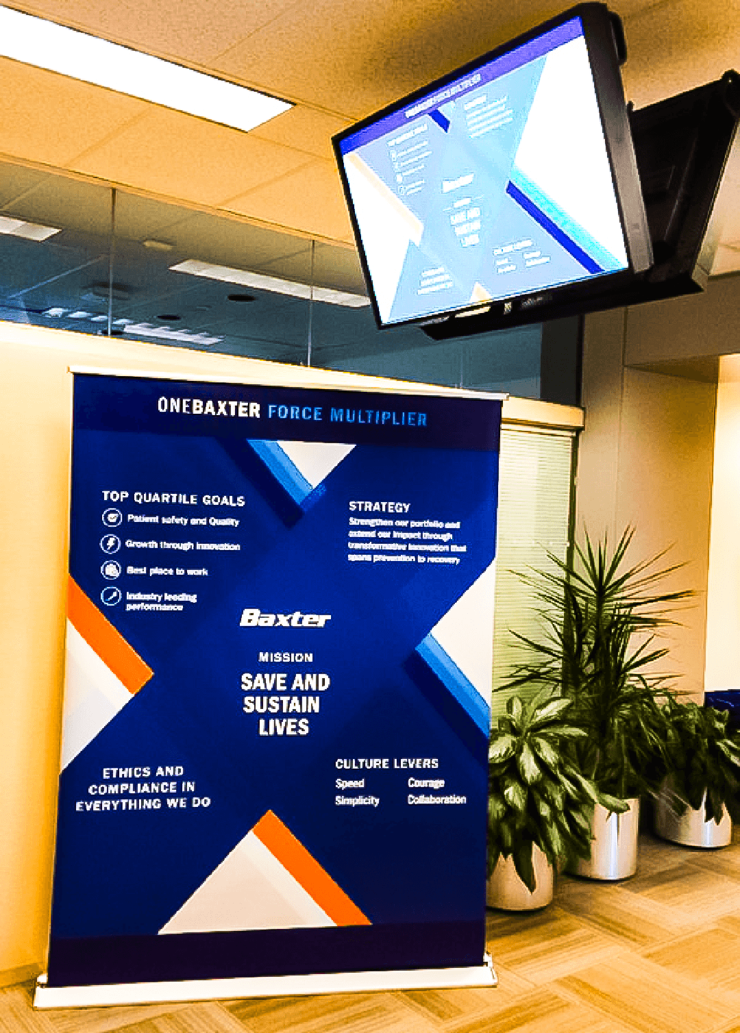 Baxter Healthcare required environmental graphics, signage, and digital communication assets that translated established brand standards into clear visual messaging across interior environments and internal communications. The system supported workplace branding and employee engagement initiatives across multiple formats and locations.